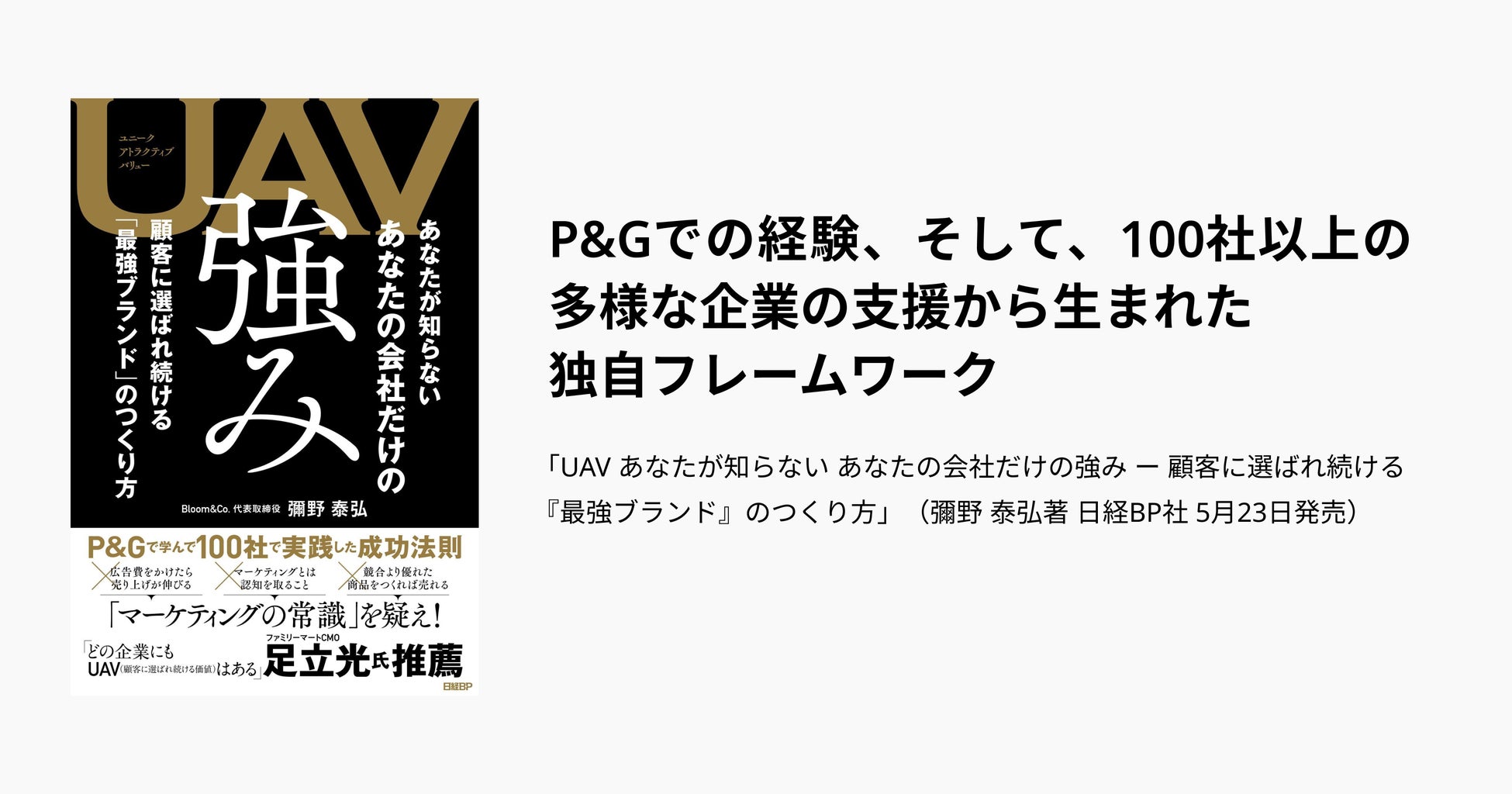 P&G出身のディレクタークラスの人材が10名以上集うマーケティングアドバイザリファーム、Bloom&Co.のこれまでの活動の集大成として、持続的な売上成長を実現するマーケティングフレームワークである「UAVマーケティング」について解説した書籍が完成いたしました。