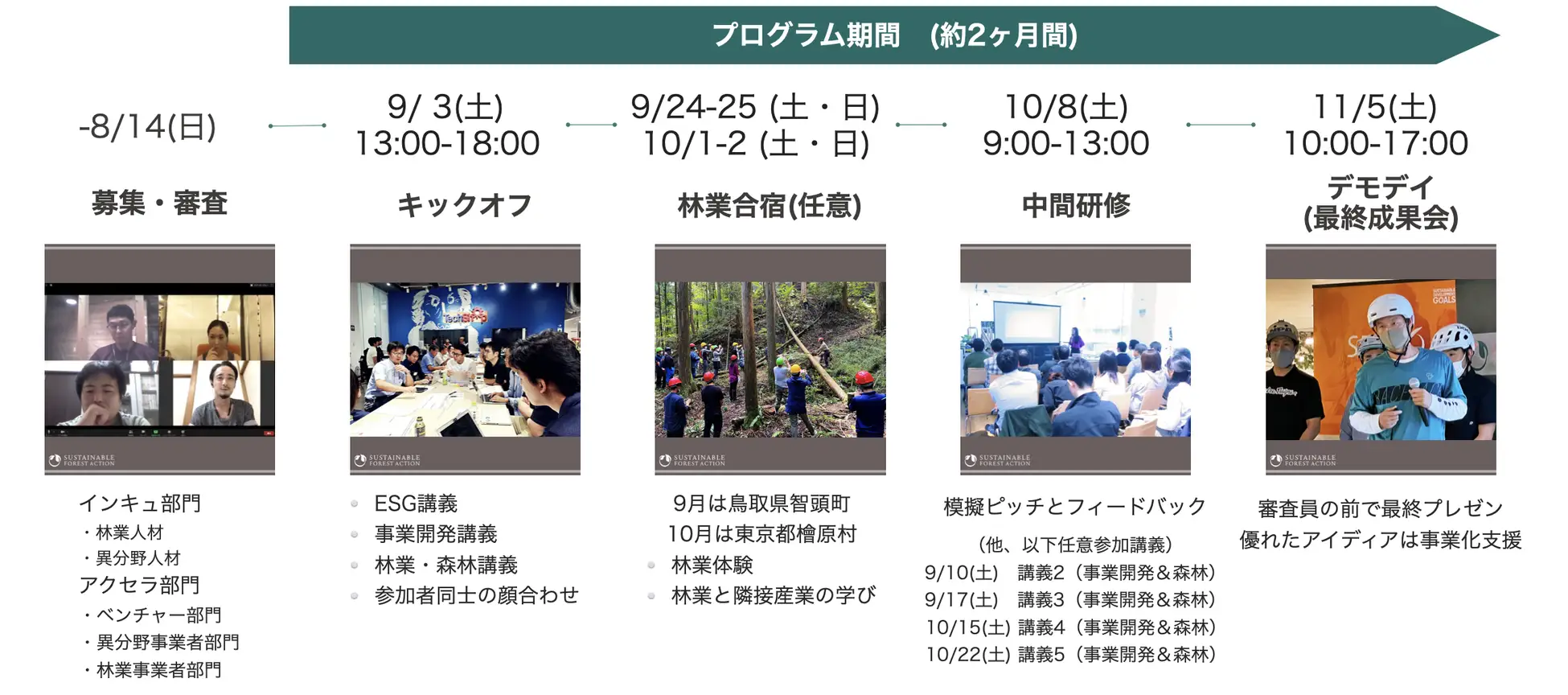 『SUSTAINABLE FOREST ACTION 2022』では、約2ヶ月間のプログラムで事業検証を進めていきます。参加チームは、各種講義(事業開発に関する講義、森林・林業に関する講義)、林業合宿(鳥取県智頭町と東京都檜原村で開催)、週次伴走メンタリング(などを受けながら、11月5日(土)に行われるデモデイに向けて、仮説検証を繰り返しながら、事業プランまで練り上げていきます。