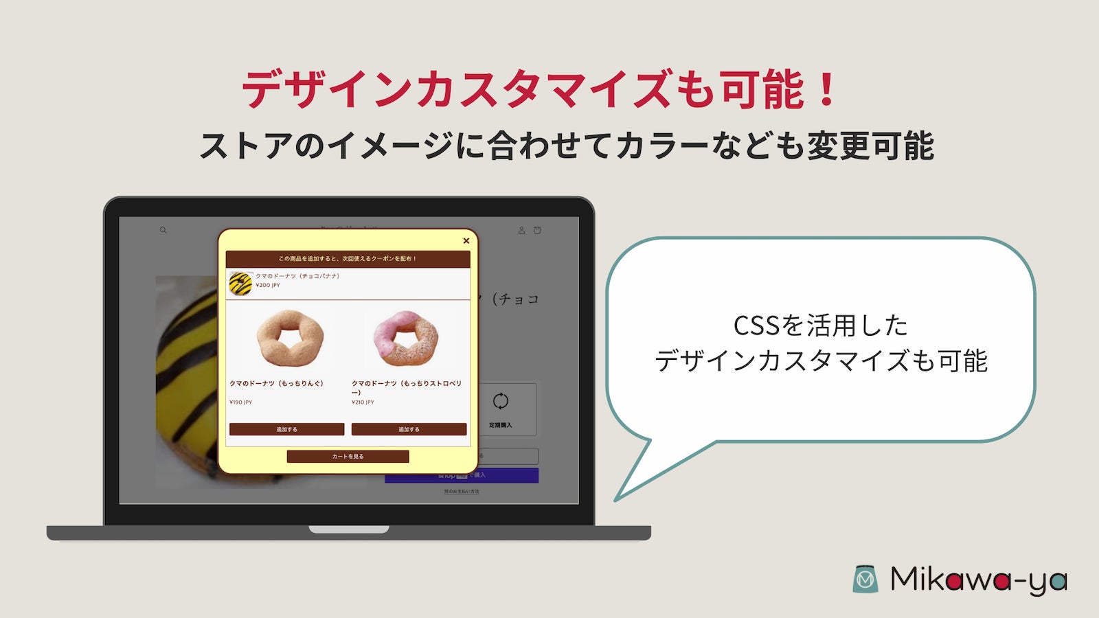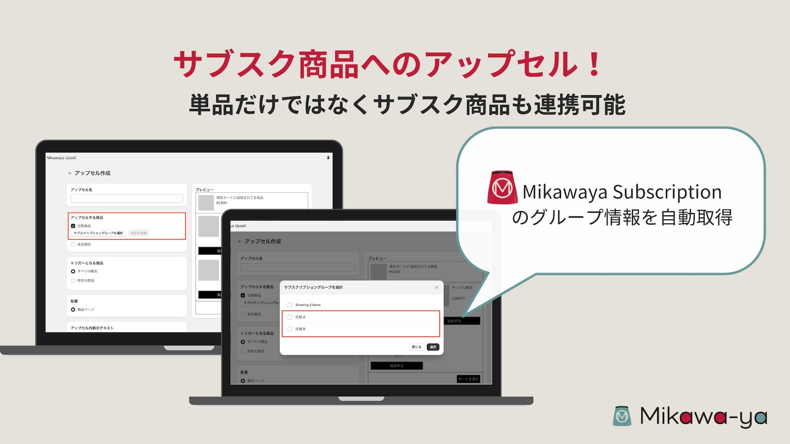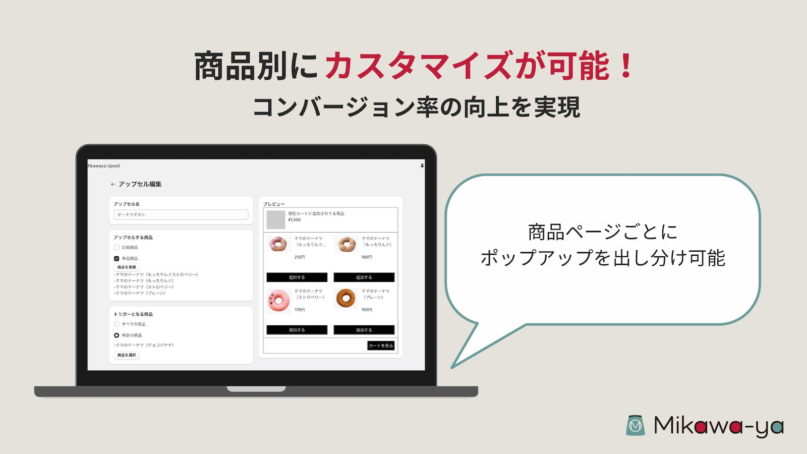 『Mikawaya Upsell』は売上向上に特化したShopifyアップセルアプリです。高い視認性のポップアップでセット購入率アップ単品商品に加えて、他のアプリでは実装することが難しい「定期商品」へのアップセル施策も可能です。