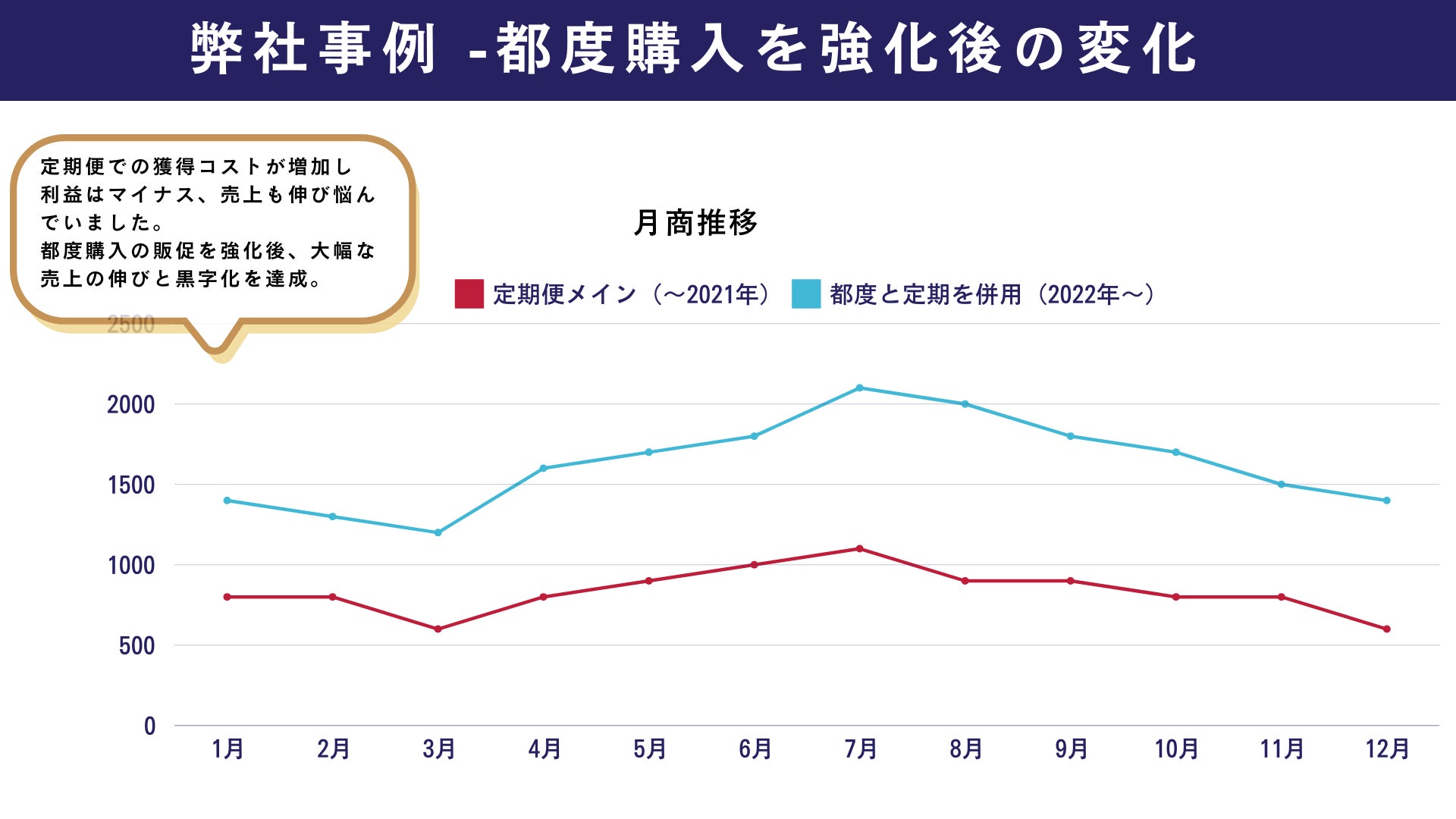 実際に、弊社の事例でも都度購入の販促を強化し始めた事で売上と利益が大きく伸びた実績も出ております。