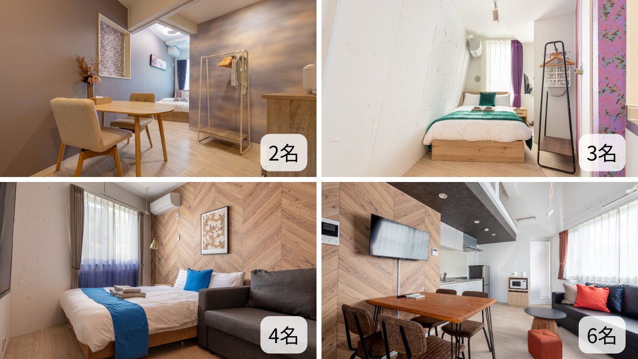 また、お部屋のタイプは4つあり、用途に合わせて部屋を選ぶことができます。部屋ごとにデザインが異なることも特徴です。特に4名様、6名様用のお部屋は家族や友人とのグループ旅行に最適です。