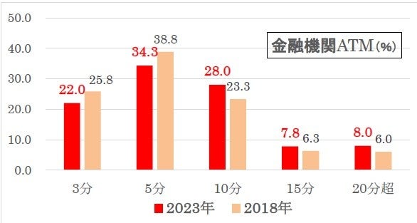 統廃合によるATM店舗の減少により、その分混んでいることもあり、並ぶのが当たり前という感覚になっているのでしょうか。また、キャッシュレス化が進みネットバンキングが普及していることで、逆にATMに行くときは並ぶ覚悟が出来ているということかもしれません。