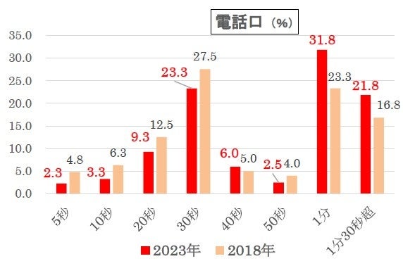 18年調査では、“30秒まで”で半数を超えて(51.1%)いましたので、少し気長になりました。メールやチャットなどネット経由の問い合わせが増えてきたことで、逆に「電話は待つもの」という認識が一般化したのかもしれません。