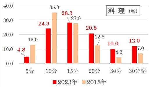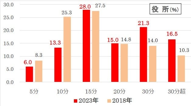 18年調査と比べ、「5分」、「10分」の割合が減り、一方、「30分」、「30分超」は増えており、少し気長になっています。