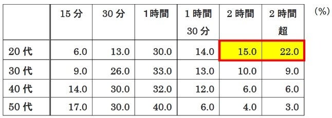 なお18年調査から「15分」が減った(58.0%→36.5%)一方、「30分」以上の各項目が増えており、気長になったようです。