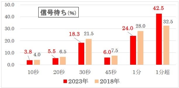 「1分超」は18年調査から10ポイント増加(32.5%→42.5%)しており、気長になっています。信号待ちの際、スマートフォンを見ている人が多く、また、残り時間を目盛り表示する信号を目にすることも多くなってきましたので、その分気長になったということかもしれません。
