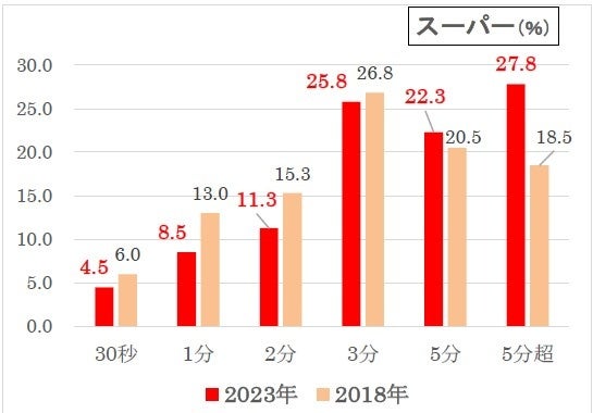 スーパーでのレジ待ち時間は、「5分超」(27.8%)、「3分」(25.8%)の順でした。18年調査と比べ、