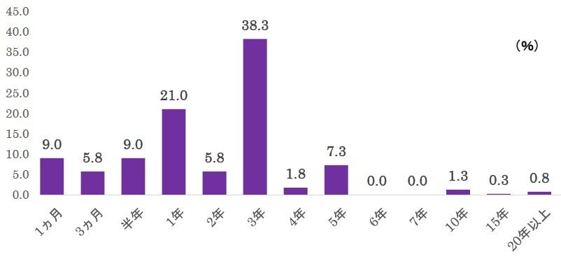 やはり、ことわざの「3年」の印象が強いためか、最も多かったのは「3年」(38.3%)でしたが、次いで「1年」(21.0%)が多く、回答の9割近く(88.9%)が“3年以内”に集中しました。