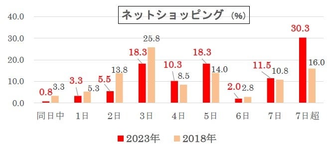 コロナ禍で利用が大きく進んだネットショッピング。「同日配送」など配送時間のスピード競争が激化していますが、結果は「7日超」が3割(30.3%)でトップ。次いで「3日」と「5日」が共に18.3%で続きました。一方、「同日中」は0.8%とごく僅か、「1日」(3.3%)、「2日」(5.5%)も少数で、利用者はそれほどスピードを求めず、気長に構えていることがわかります。