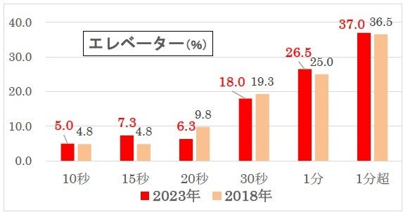 エレベーターは「1分超」(37.0%)、「1分」(26.5%)が多く、この2つを合わせると6割を超え(63.5%)