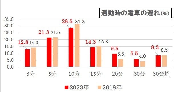 「10分」(28.5%)がトップ、次いで「5分」(21.3%)でした。“10分まで”では6割強(62.6%)がイライラを感じており、18年調査(66.8%)とほぼ同じです。日本の鉄道は定刻運行が当たり前になっているため、慌ただしい通勤時に電車が10分遅れると致命的です。