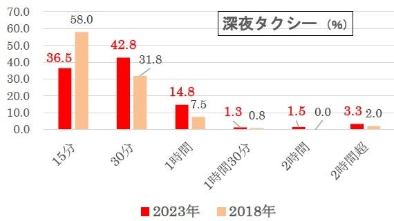 深夜タクシー待ちの覚悟は、「30分」(42.8%)が最も多く、次いで「15分」(36.5%)でした。この2つを合わせると約8割(79.3%)となり、“30分まで覚悟”が一般的な意識のようです。