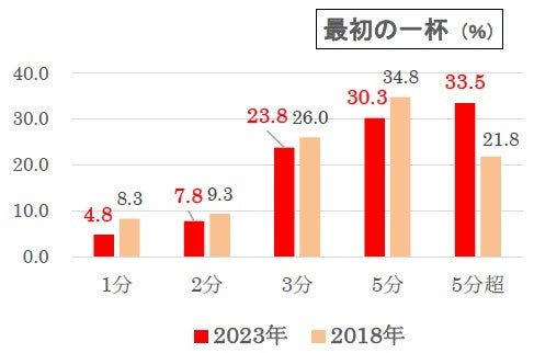 最初の一杯が揃ってからが飲み会のはじまりです。結果は、「5分超」(33.5%)、「5分」(30.3%)の順で、2つを合わせると6割を超え(63.8%)ます。