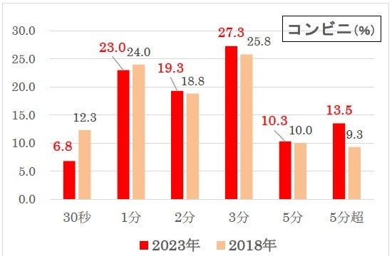 18年調査と比べ、「5分超」が増え(9.3%→13.5%)ており、コンビニも若干気長になったと言えそうです。