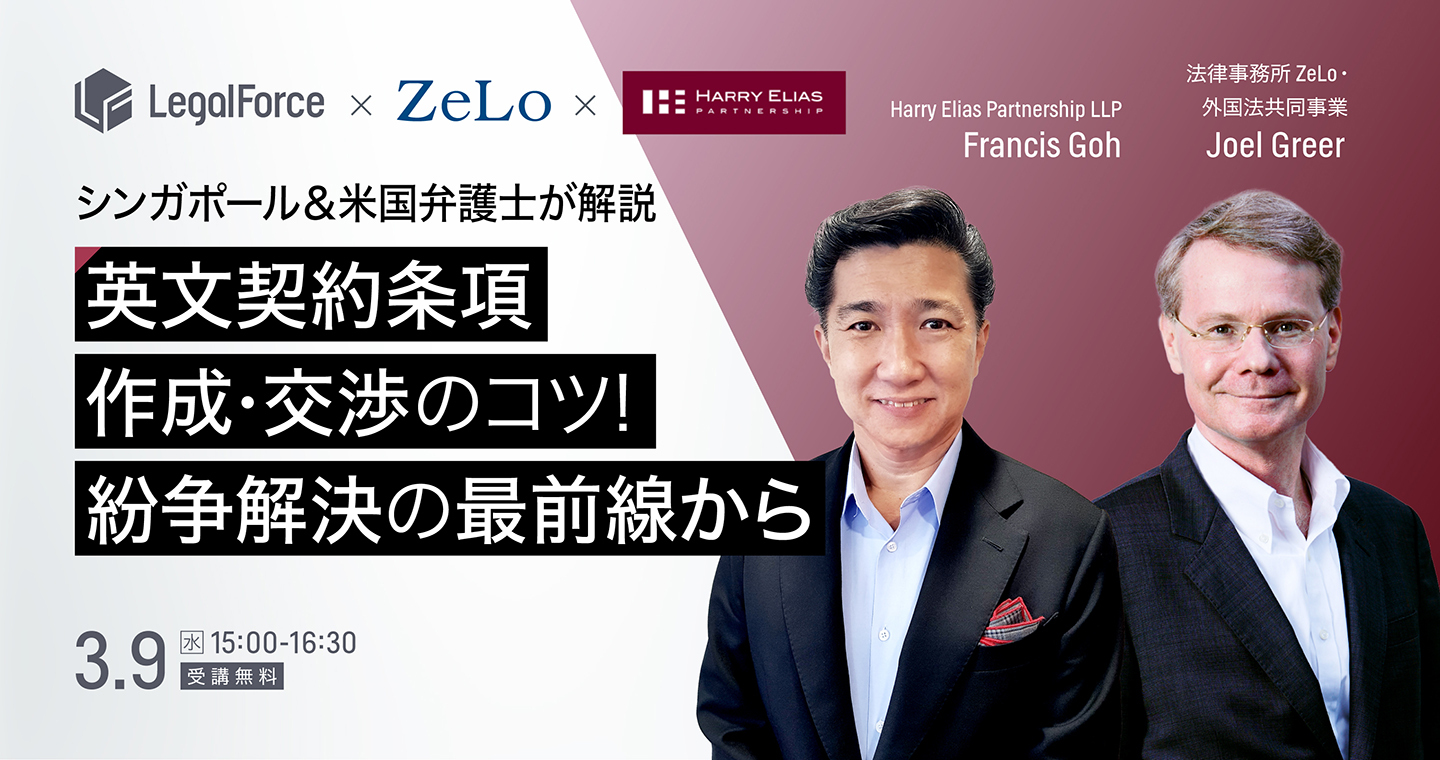 法律事務所ZeLo・外国法共同事業(所在地:東京都江東区、代表弁護士:小笠原匡隆、以下「法律事務所ZeLo」。https://zelojapan.com/)は、シンガポールの国際的なローファームであるHARRY ELIAS PARTNERSHIP(https://www.harryelias.com/)のFrancis Goh弁護士(日本では未登録)をゲストに迎え、オンラインセミナー「英文契約条項作成・交渉のコツ!紛争解決の最前線から シンガポール&米国弁護士が解説」を2022年3月9日(水)に株式会社LegalForceと共催することをお知らせいたします。
