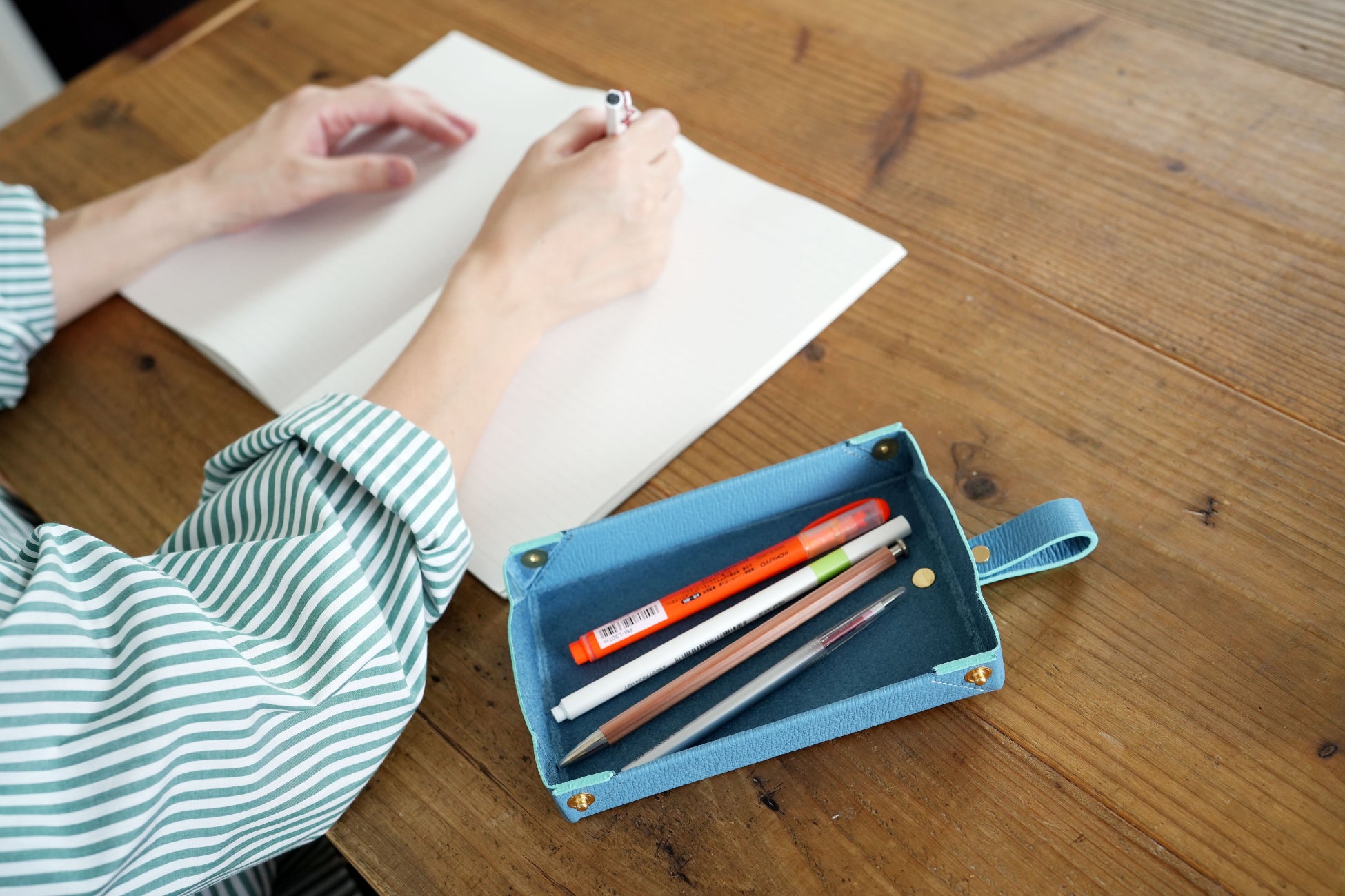 dritto Pen rollはペントレイに変身するペンケースです。一枚革を折り紙のように折りたたんで立体にする事でペントレイの形から丸め込んでペンケースにする事が可能になりました。ペン全体が視認出来るので取り出しやすく、革の弾性と硬化性を利用し収納時には中のペンが動かずペンを傷つける心配がありません。