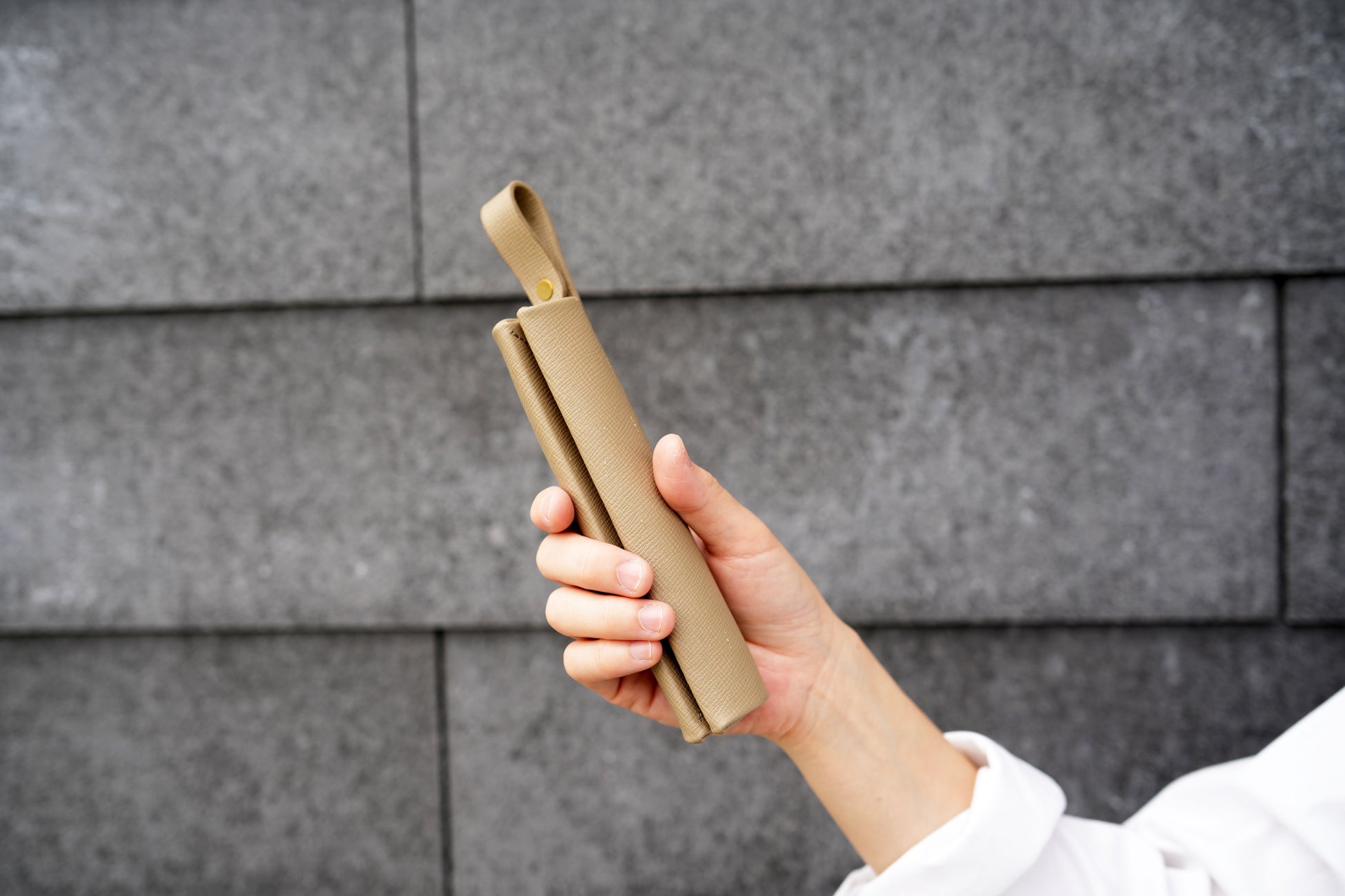 本体に開閉式のループをプラスしバックの持ち手に取り付けたり首から下げて移動する事が可能になりました。革は傷や水濡れに強い国産エンボスレザーをラインナップに加え、気軽に使用する事が可能になりました。
