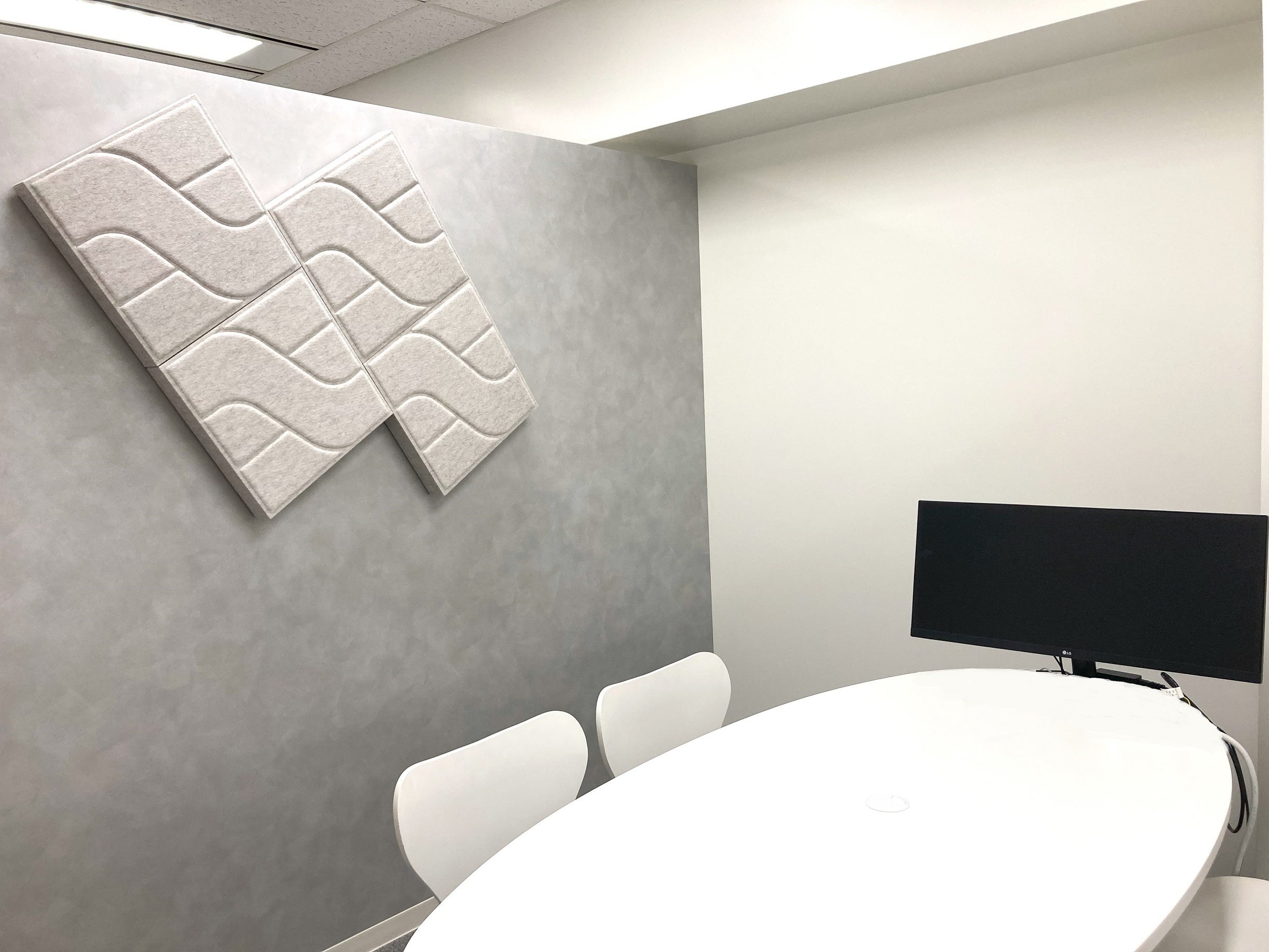 エントランスは無(人工素材)・有(木材)と対になる素材や配色を折り込み、各マテリアルの配置には、ADDIEモデルの正五角形からインスパイアされたデザインを美しく表現するために黄金比を用い意匠を構築。インストラクショナルデザインの理論性を具現化いたしました。また格子を整然と配し、一部壁面にはガラスを用いて社内の様子が見て取れることで、開かれた、また奥行きのある空間計画としています。