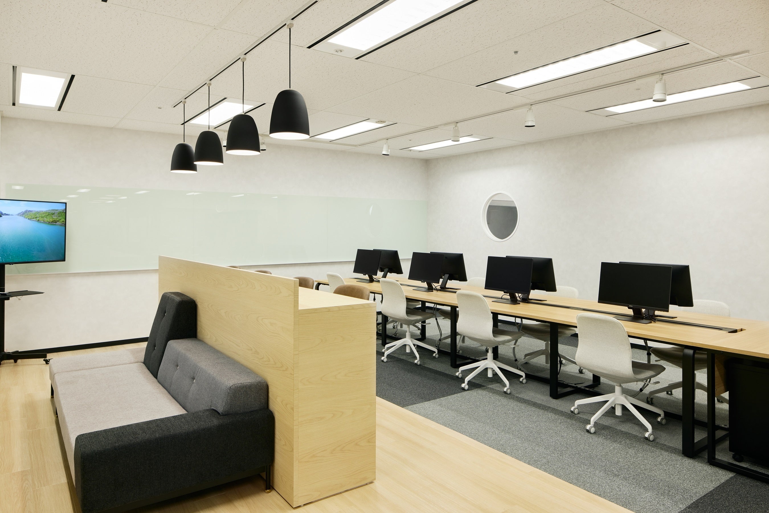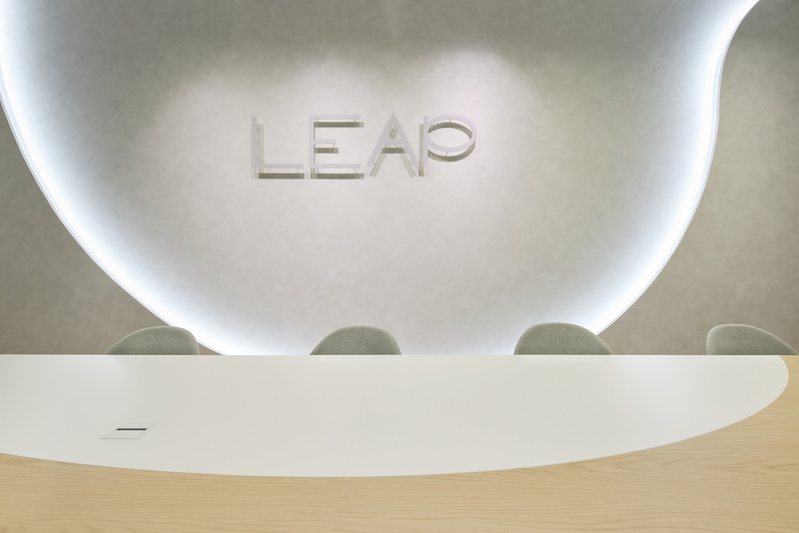 セイタロウデザイン⾦沢・宮川智志⽒が監修した新オフィス。インストラクショナルデザインで実現したい人材育成を黄金比&無機・有機の融合で表現し、リープのサービス価値を最大化する機能的なオフィスに