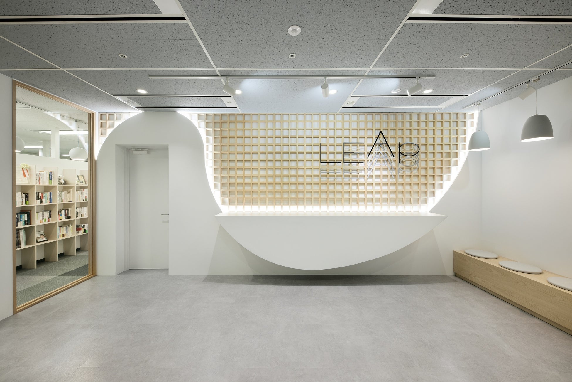 リープの特徴は「論理性を大事にする数学的なデータ分析」と、「対話を突き詰めた情熱的な人材育成」という異なる要素の組み合わせであり、その理念は教育工学「インストラクショナルデザイン」に由来するのことで、このリープのサービスを可視化するために無機的なものと有機的なものの対比(異なる要素の対比)が見られるデザインをメインのコンセプトに据え、空間に落とし込みました。