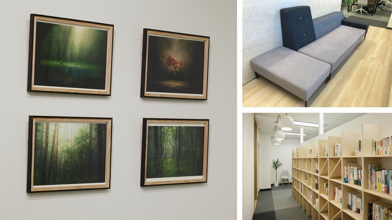 心象風景を表現する写真家竹腰隼人氏(https://www.h-takekoshi.com/)の作品が展示されているギャラリー(写真左)、東京湾やレインボーブリッジを眺めながら思考を切り替えるリフレッシュエリア(写真右上)や、知の厳選であるライブラリ(写真右下)などを通して、当社の目指す“Leap’s Sail”をメンバー1人ひとりが体現し、より一層ユニークなリープサービスのクリエティビティ実現を目指す。