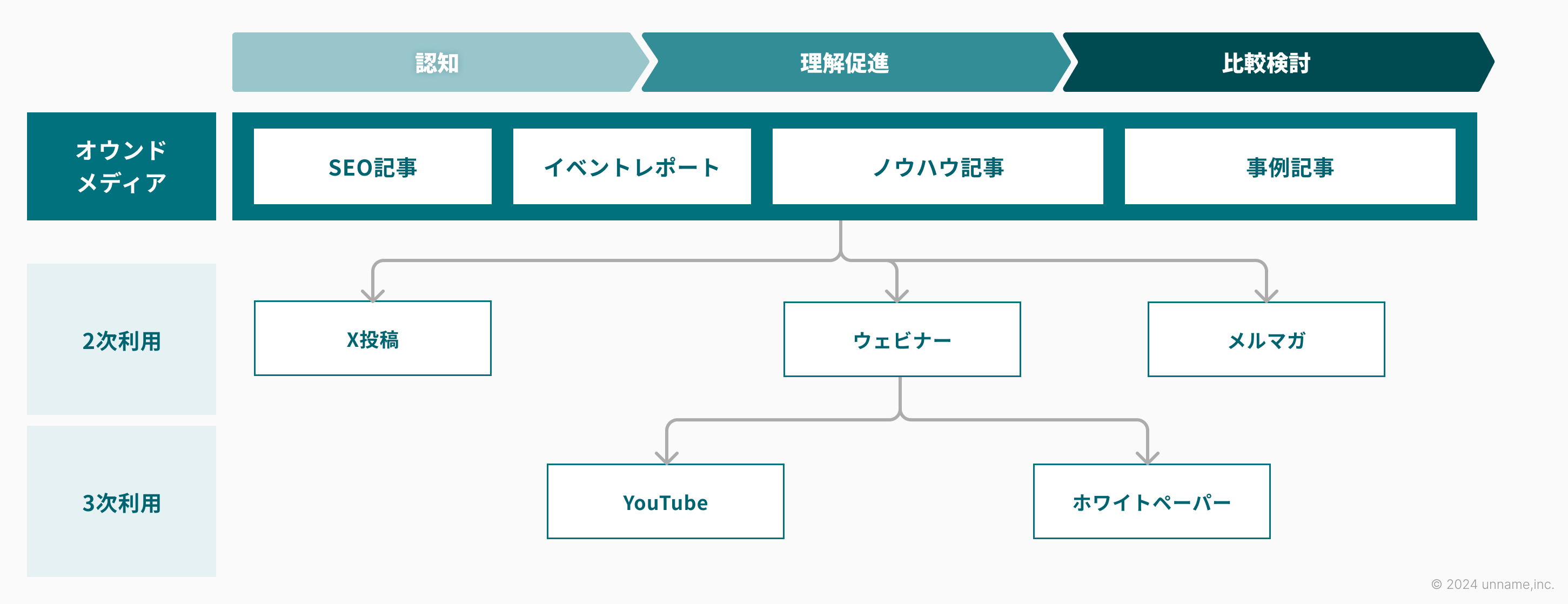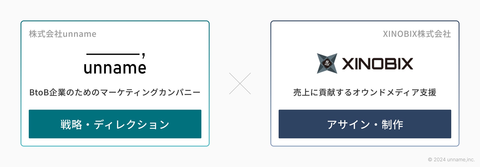 BtoBマーケティングの全体戦略の立案やディレクションに強みをもつunnameと、BtoB向けのオウンドメディア構築に強いXINOBIXがタッグを組んで、成果を出すところまでご支援致します。