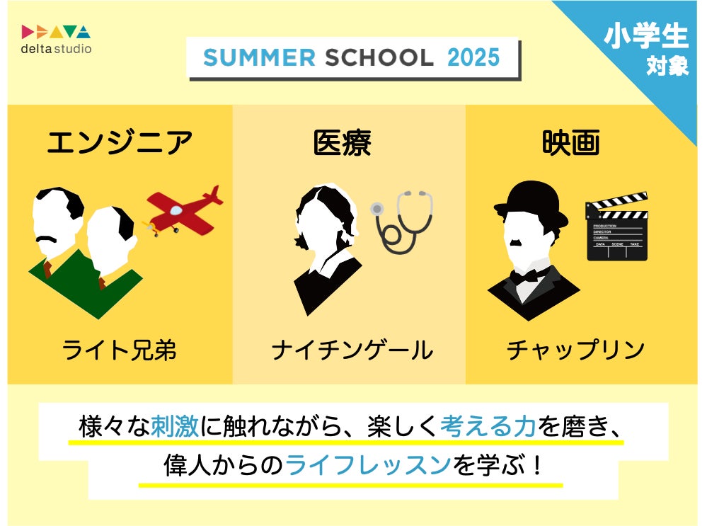 そんな今話題の探究教育のパイオニア・デルタスタジオ(東京・広尾)が、7, 8月にサマースクールを開催します。小学生向けには「エンジニア」「医療」「映画」など通塾クラスでも大人気なテーマをご用意!体験型授業を通じて、楽しく考える力を磨き、偉人からのライフレッスンを学びます。年中・年長向けには「はじめての映画」「はじめてのおつかい」と、好奇心と挑戦心を育むプログラムを実施します。(HP:https://whatisyourdelta.com/education/)
