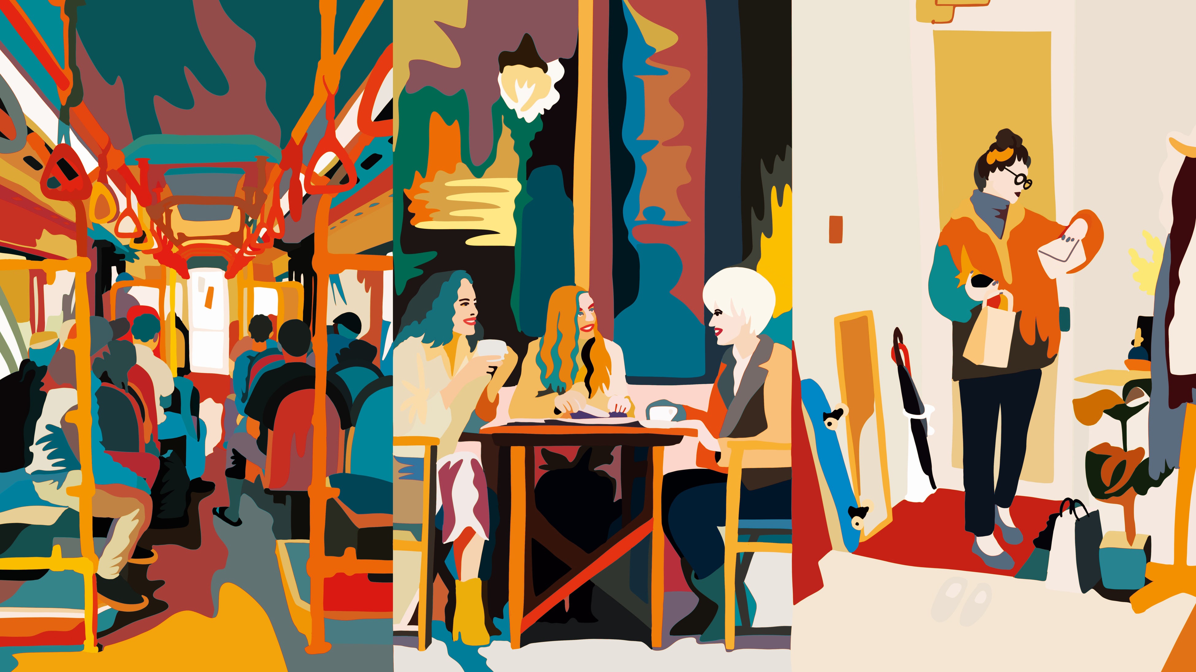 働くこと、遊ぶこと、日常のワンシーンには見落としがちな彩りとトキメキが溢れているから、通勤中、会食中、自宅に帰った時をイラストにしカラフルでどこか優しさのある色合いで描き留めました。