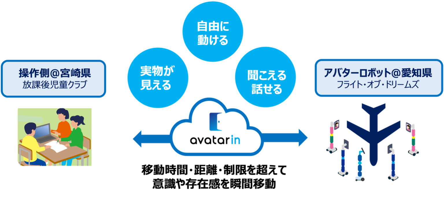実証概要: 児童がフライト・オブ・ドリームズにあるアバターロボットを遠隔操作し、航空機に関する