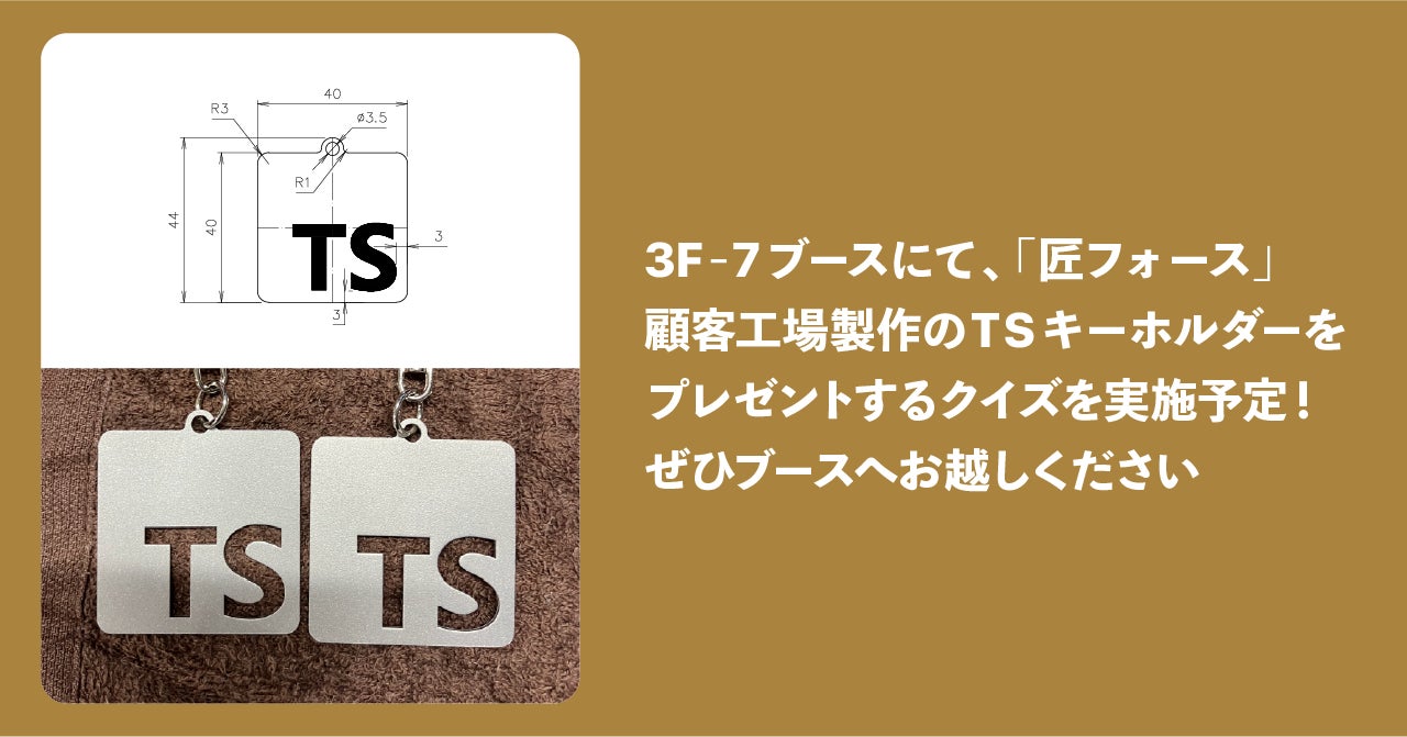 また、匠フォースの顧客工場様に製作してたいただいた、「TSキーホルダー」をご用意しました。TypeScriptに関するクイズにお答えいただいた方へのプレゼントを予定しておりますので、ぜひブースまでお気軽にお立ち寄りお越しください。