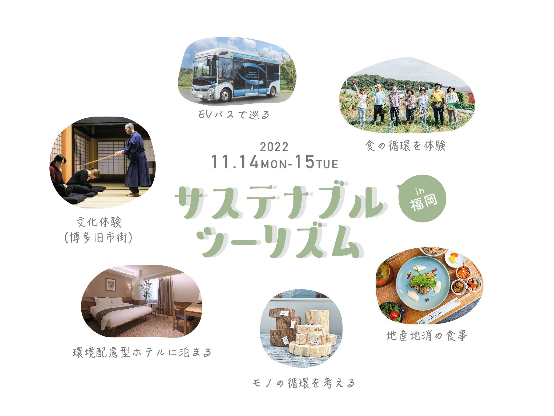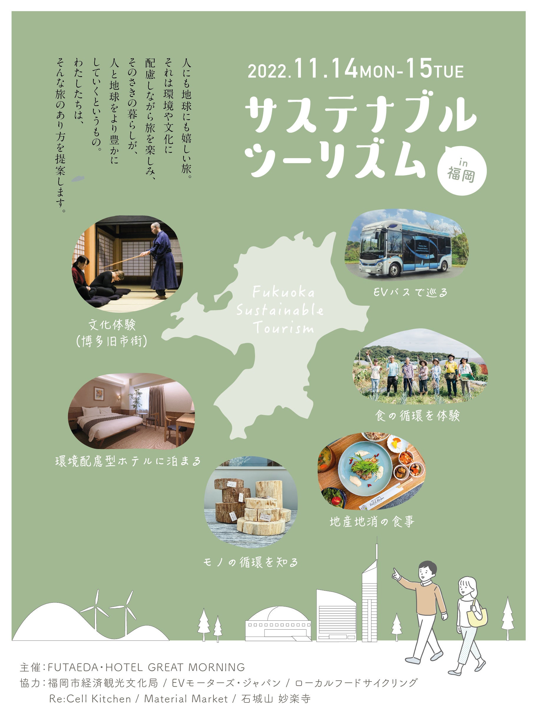 “#サステナブルツーリズム”プロジェクトは、SDGsのターゲットにも掲げられ、重要な課題となっている食・もの・文化・健康・エネルギーへの意識向上を、観光を通じて促進するべく、ホテルグレートモーニング博多と福岡市及び市内を拠点に環境配慮型のビジネスを展開する事業者が協働しモデルツアーを実施いたします。