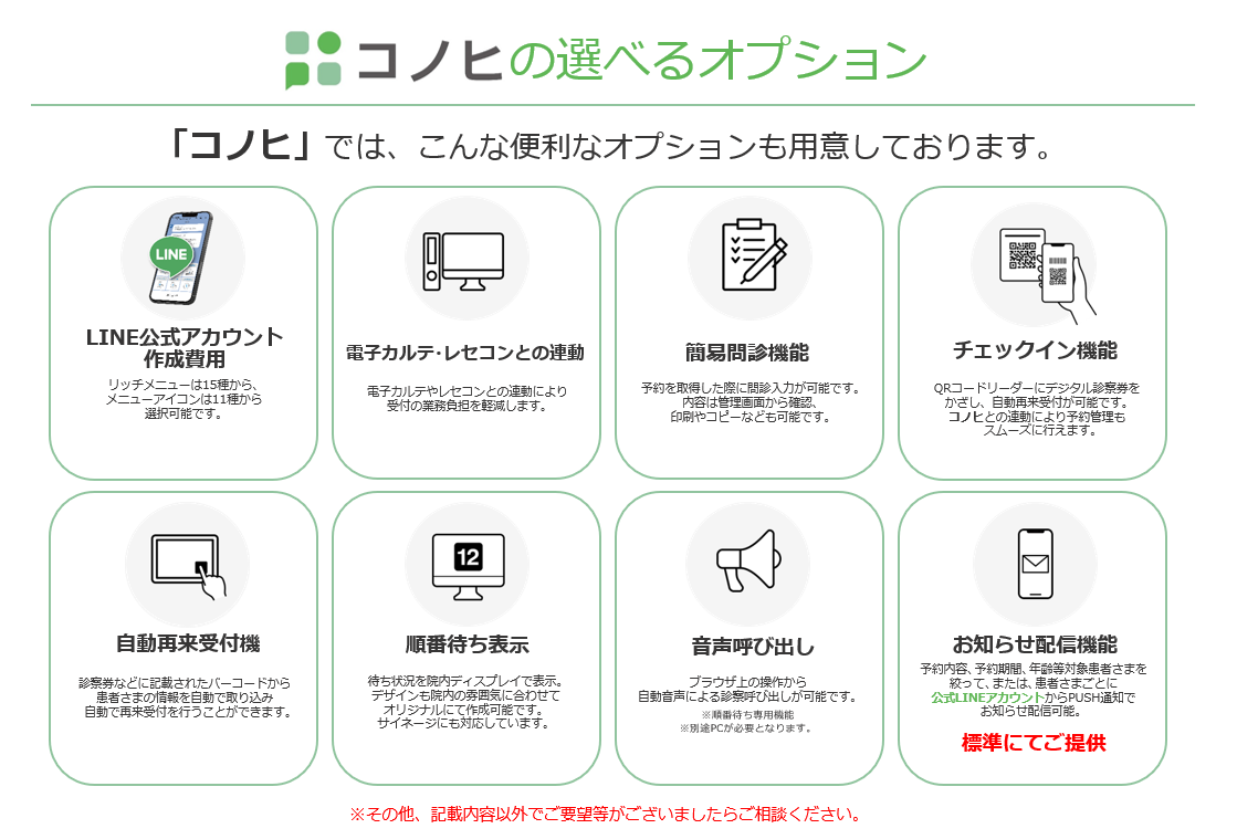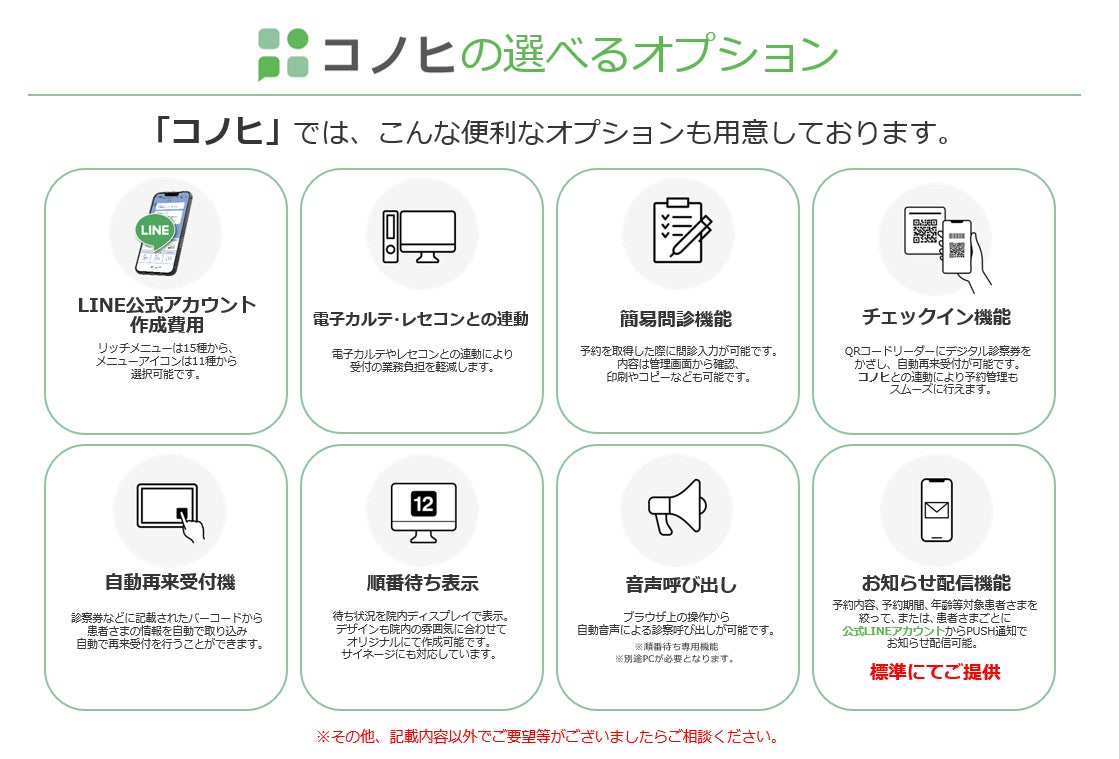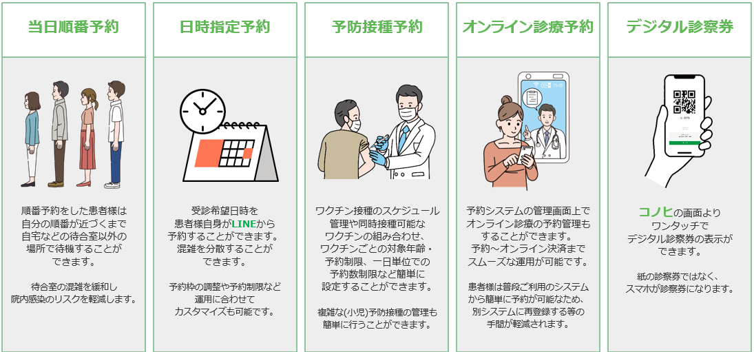 「コノヒ」では当日順番・日時指定・予防接種予約・オンライン診療予約・デジタル診察券などクリニックの運用に合わせたさまざまな予約が可能です。