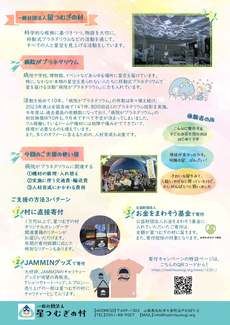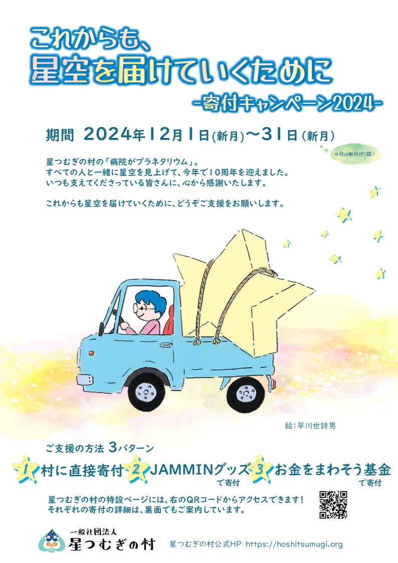 京都発チャリティー専門ファッションブランドJAMMINとコラボレーションし、星つむぎの村デザインのアイテムが12月中に再販売されます。Tシャツやトートバッグ、パーカーにエプロンなど様々なアイテムが目白押し。購入いただいた金額の一部(Tシャツ1枚につき700円)がチャリティーとして星つむぎの村に入ります。