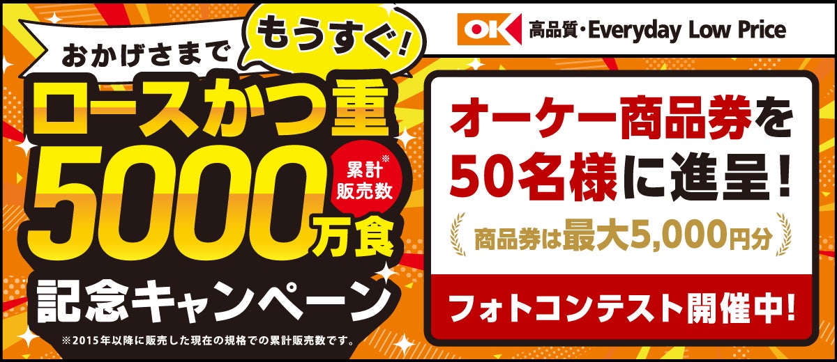 ディスカウント・スーパーマーケット「オーケー」、カナダ産三元豚を使用した「ロースかつ重」まもなく累計5000万食達成!感謝を込めて、商品券が当たる!記念フォトコンテストを開催します!