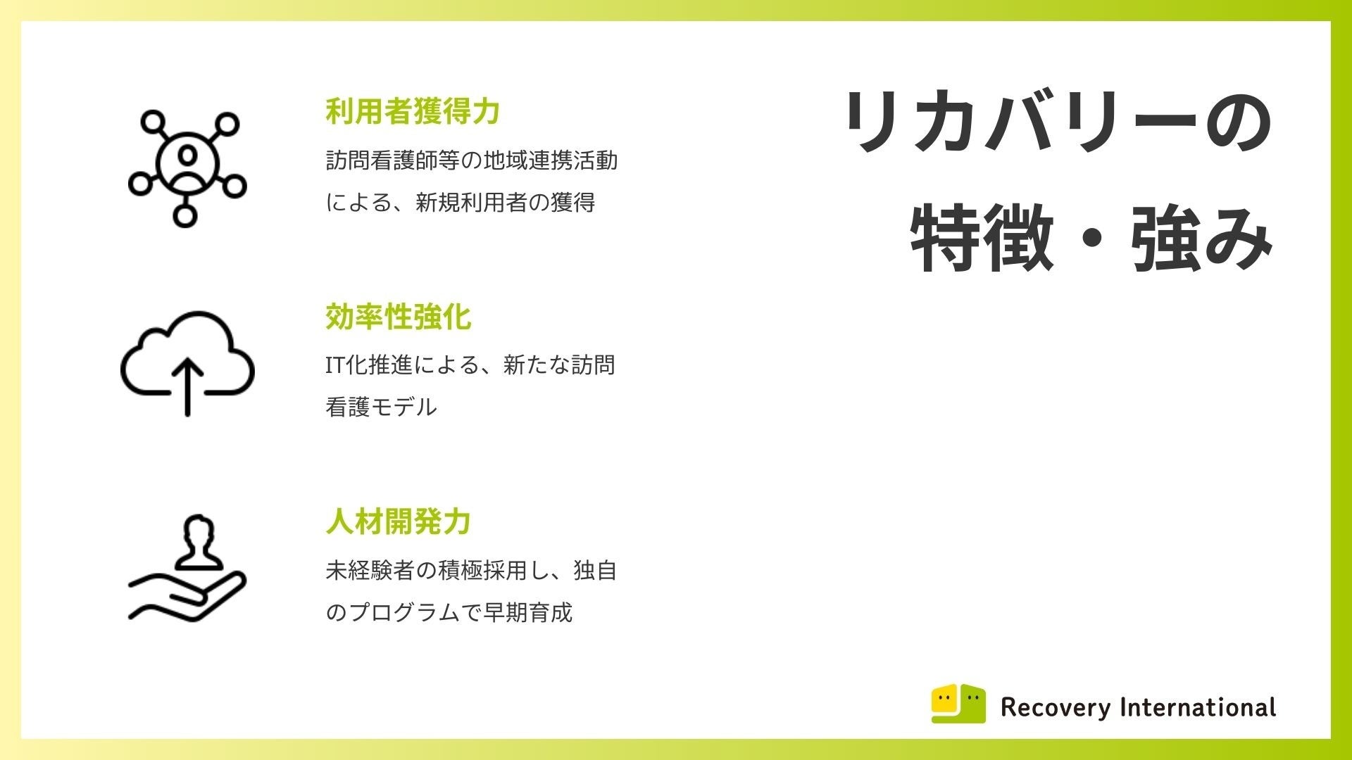 Recovery International株式会社は訪問看護ステーションを展開し、2022年2月に東証マザーズ市場(現、グロース市場)へ上場し、2022年12月期は過去最高の売上高、当期純利益を達成しています。訪問看護は近年注目されており、当社は企業理念に「もう一人のあたたかい家族として在宅生活の安心を届け地域社会へ貢献します」を掲げ、2024年5月時点で1都3県27事業所の展開を行っております。