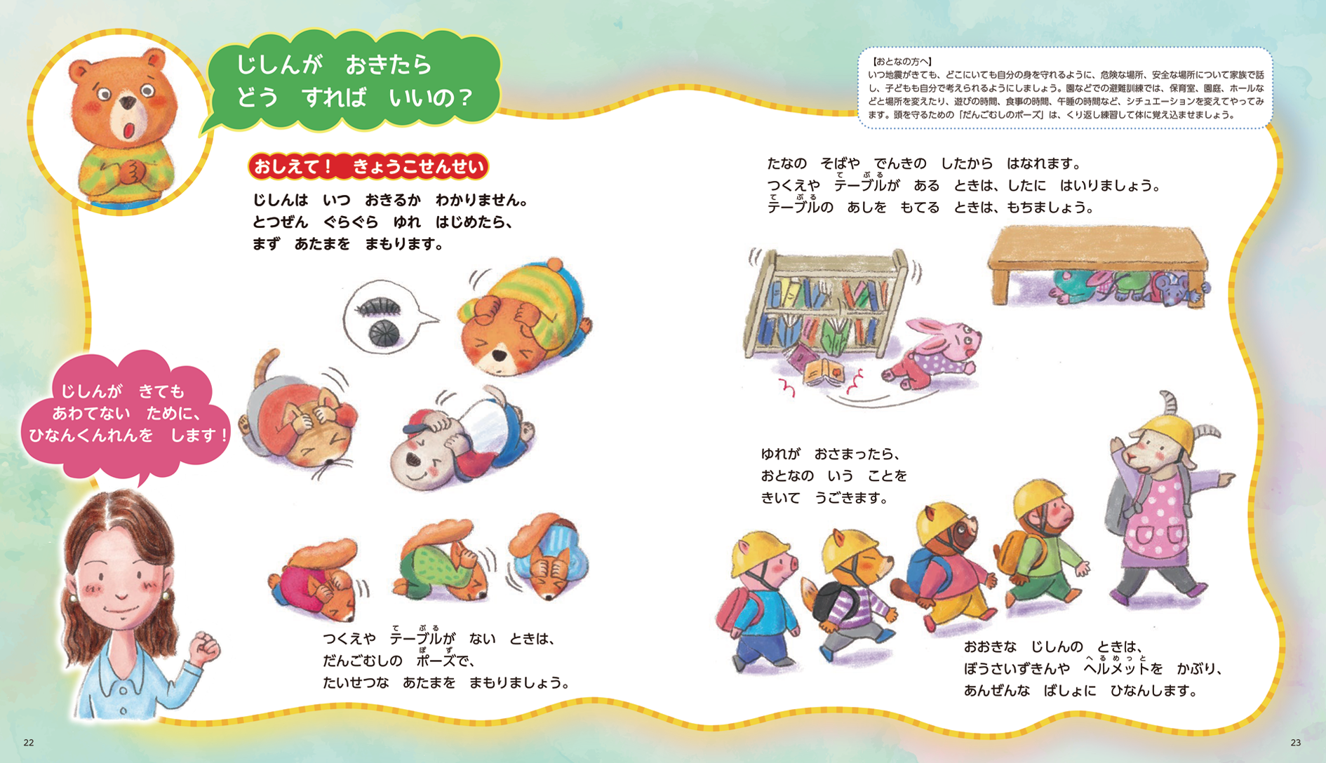 本書は、監修の月ヶ瀬恭子先生が絵本の中で「きょうこ先生」として登場し、災害が発生したときにとるべき行動や事前の準備・心構えについて、わかりやすく解説しています。本書を読むことで、子どもたちの抱く「なんで?」「どうして?」といった疑問にもしっかりと答えられるので、子どもにもわかりやすく防災について伝えられます。