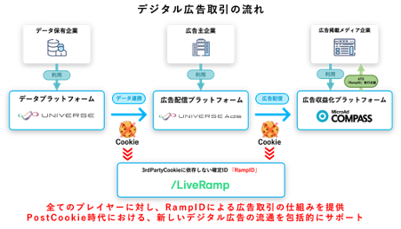データ保有企業は、「RampID」を導入することで、サードパーティCookieを利用せずに「UNIVERSE」へのデータ提供が可能になります。「UNIVERSE」へ蓄積されたデータは、「UNIVERSE Ads」を通じて様々な企業に活用されることで、Cookie規制後も継続的に保有データの収益化が期待できます。