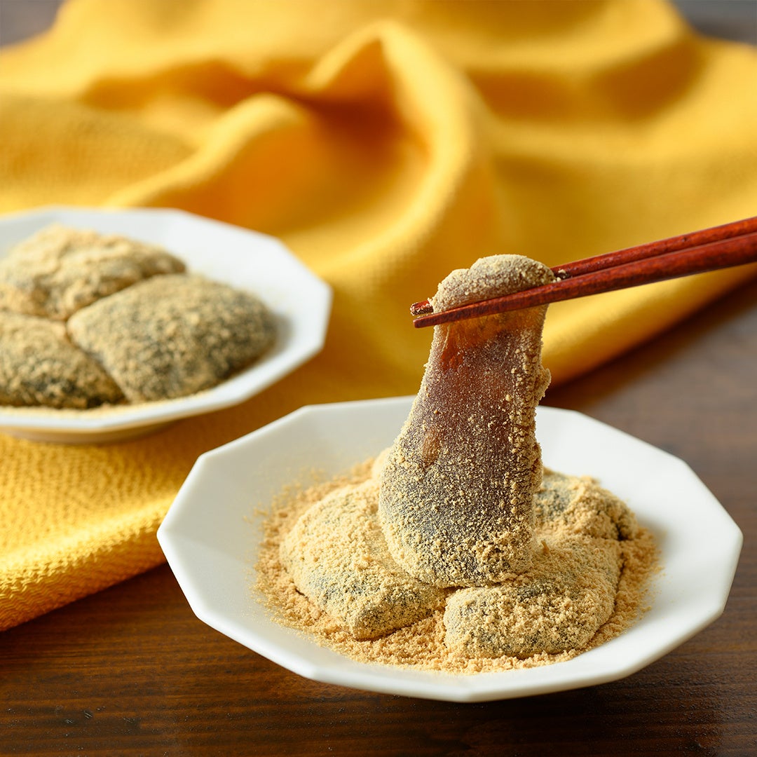 如水庵自慢の黄な粉(タマホマレ)を贅沢に使用した黒糖入りわらびもちでございます。