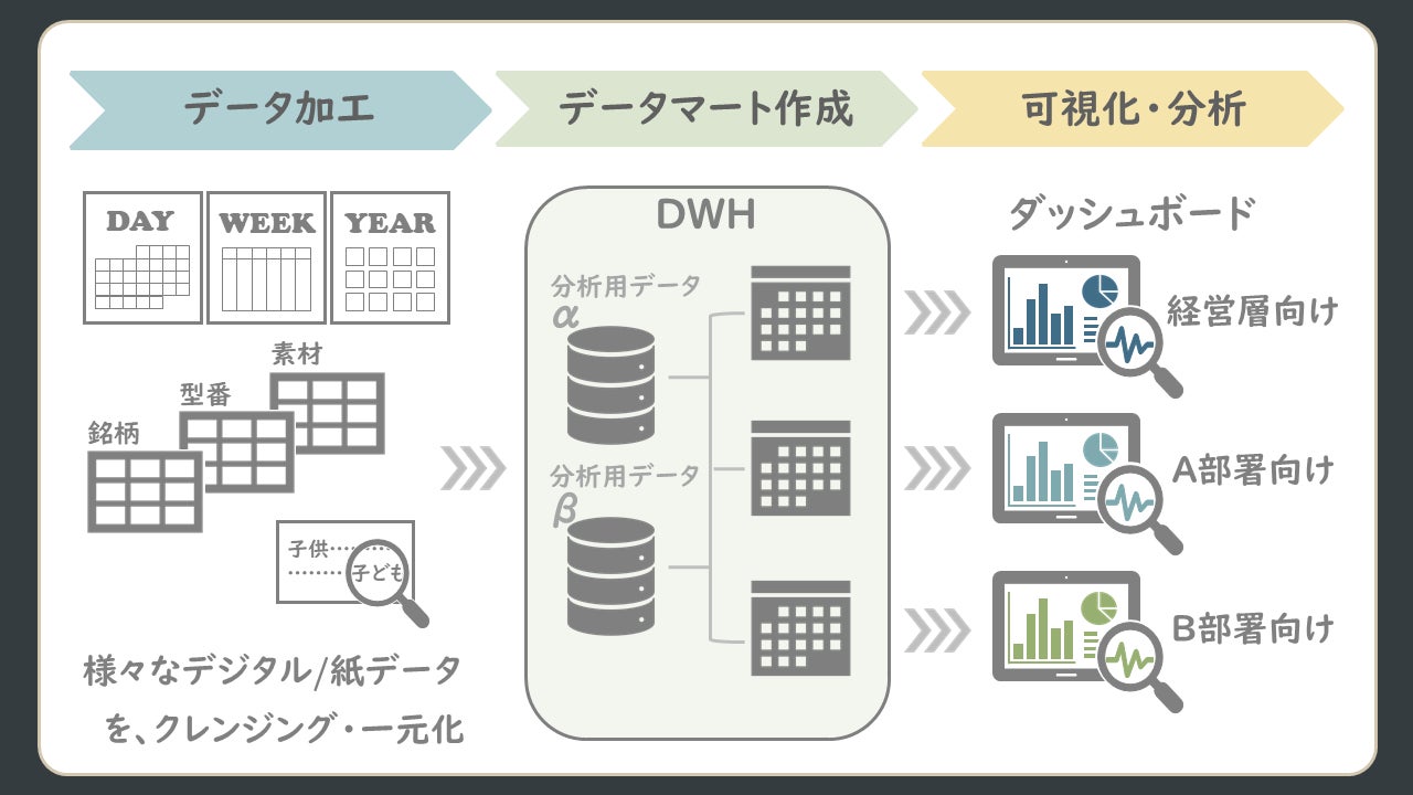 次に、利用部署や目的に合わせて、データをダッシュボード上で可視化できる分析基盤の構築をサポートしました。さらに、継続的な分析を可能にするため、データの定期的な更新作業も支援しています。