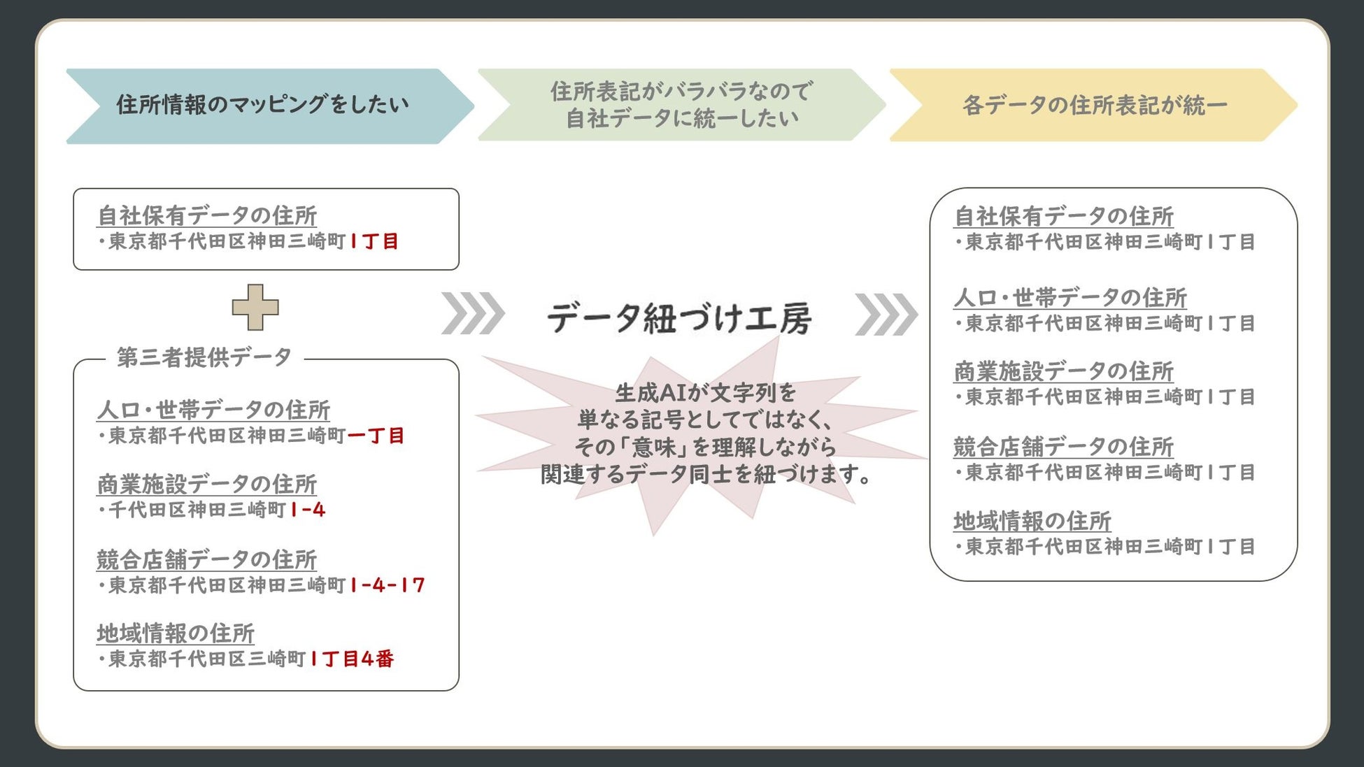 各データで住所表記が異なる場合、データ間の紐づけが困難となり分析の精度や効率が低下します。