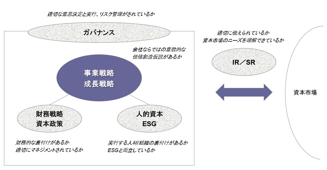 資本市場対応には、①事業戦略・成長戦略、②財務戦略・資本政策、③人的資本・サステナビリティ、④ガバナンス、⑤IR/SRの視点で、まずは「失点」を作らないことが重要ではあるが、最終的には①の事業戦略が全ての出発点となる