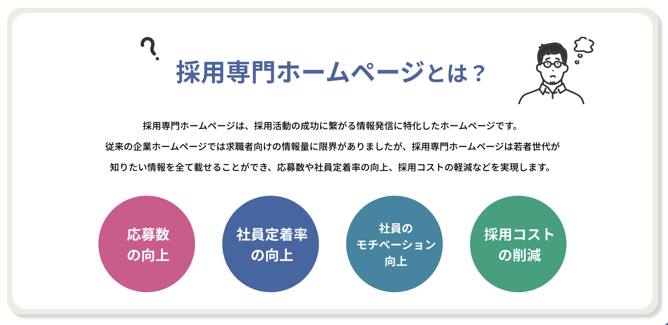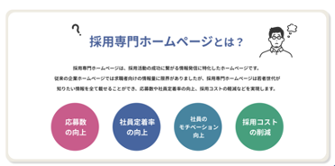 こうした状況であるにもかかわらず、ほとんどの中小企業は採用サイトを持っていません。かといって中小企業が大手の採用サイトに自社情報を掲載しても、埋没してしまいます。自社だけの採用専用サイトを持つことは、採用難に苦しむ中小企業にとって、まさに喫緊の課題なのです。