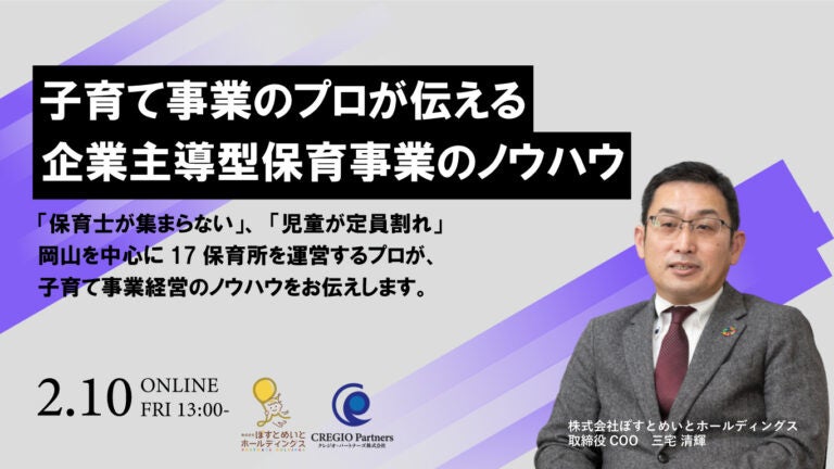 クレジオ・パートナーズ株式会社(広島県広島市、代表取締役 李 志翔)は、株式会社ぽすとめいとホールディングス(岡山県岡山市、代表取締役 CEO 鈴村 淳)と共に、企業主導型保育事業をテーマに子育て事業の経営課題解決のヒントをお伝えする「子育て事業のプロが伝える企業主導型保育事業のノウハウ」を開催します。