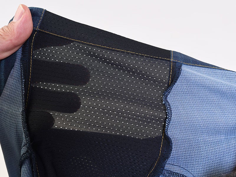 股部分には軽量ピンメッシュ素材を使用。通気性と伸縮性を確保しつつ、透けにくい安心仕様です。