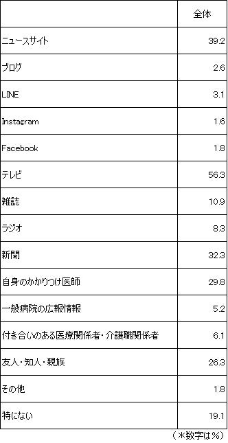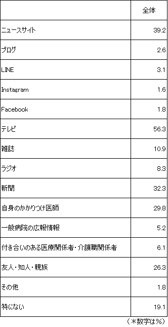 次に、病院や健康の情報をどこから入手いているかという調査では、1位:テレビ(56.3%)、2位:ニュースサイト(39.2%)、3位:新聞(32.3%)となり、インターネット利用が(新聞以上に)多い結果となった。