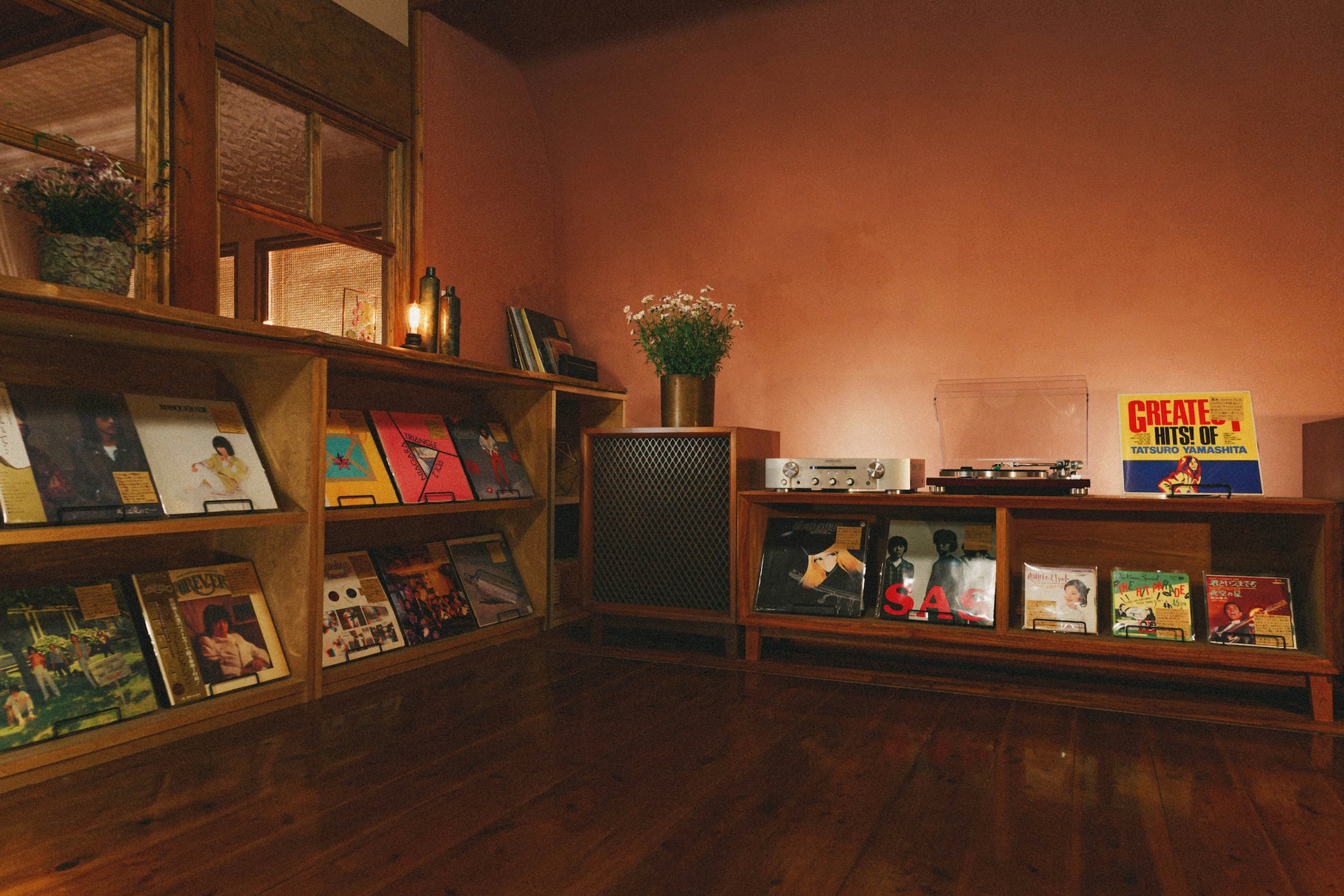 メインスペースとなるラウンジには、こだわりのレコードプレーヤーと 軽やかでムーディーな昭和歌謡のレコード50枚をセレクトしたコーナーをご用意しました。