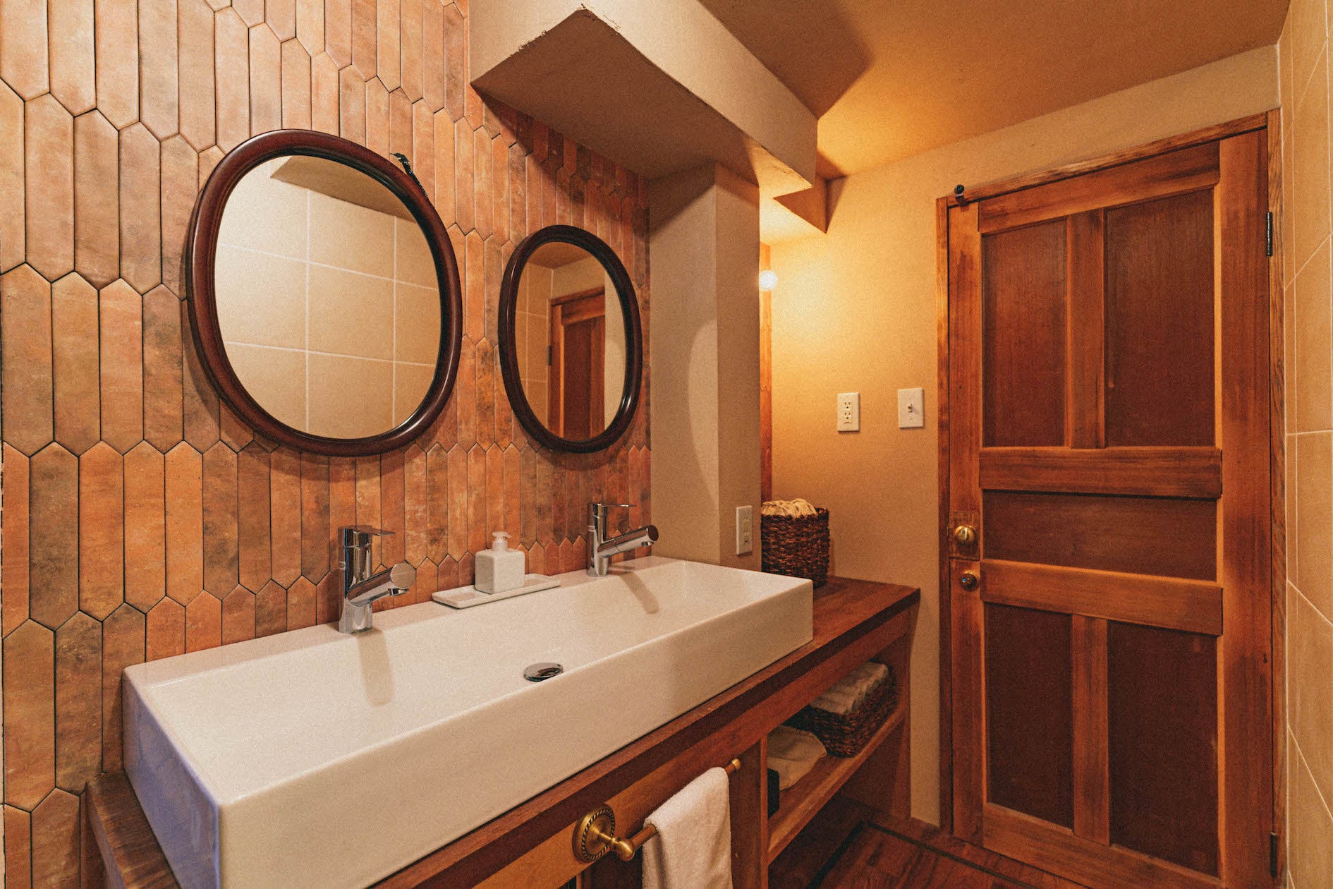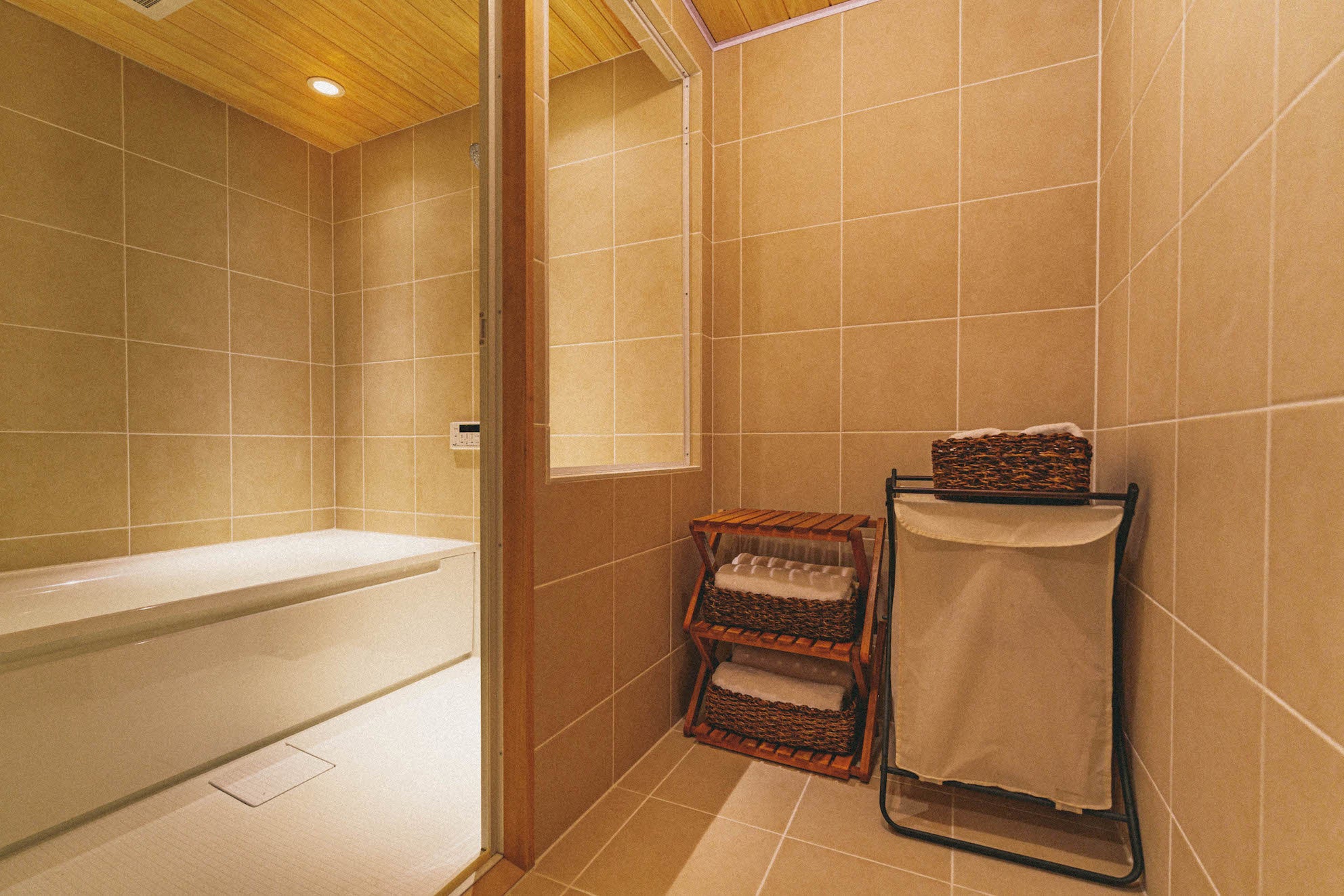 2人並んでゆったりとお使いいただけるパウダールームと、木の天井がほっと落ち着くシンプルな浴室。ゆったり体を伸ばしてお過ごしください。