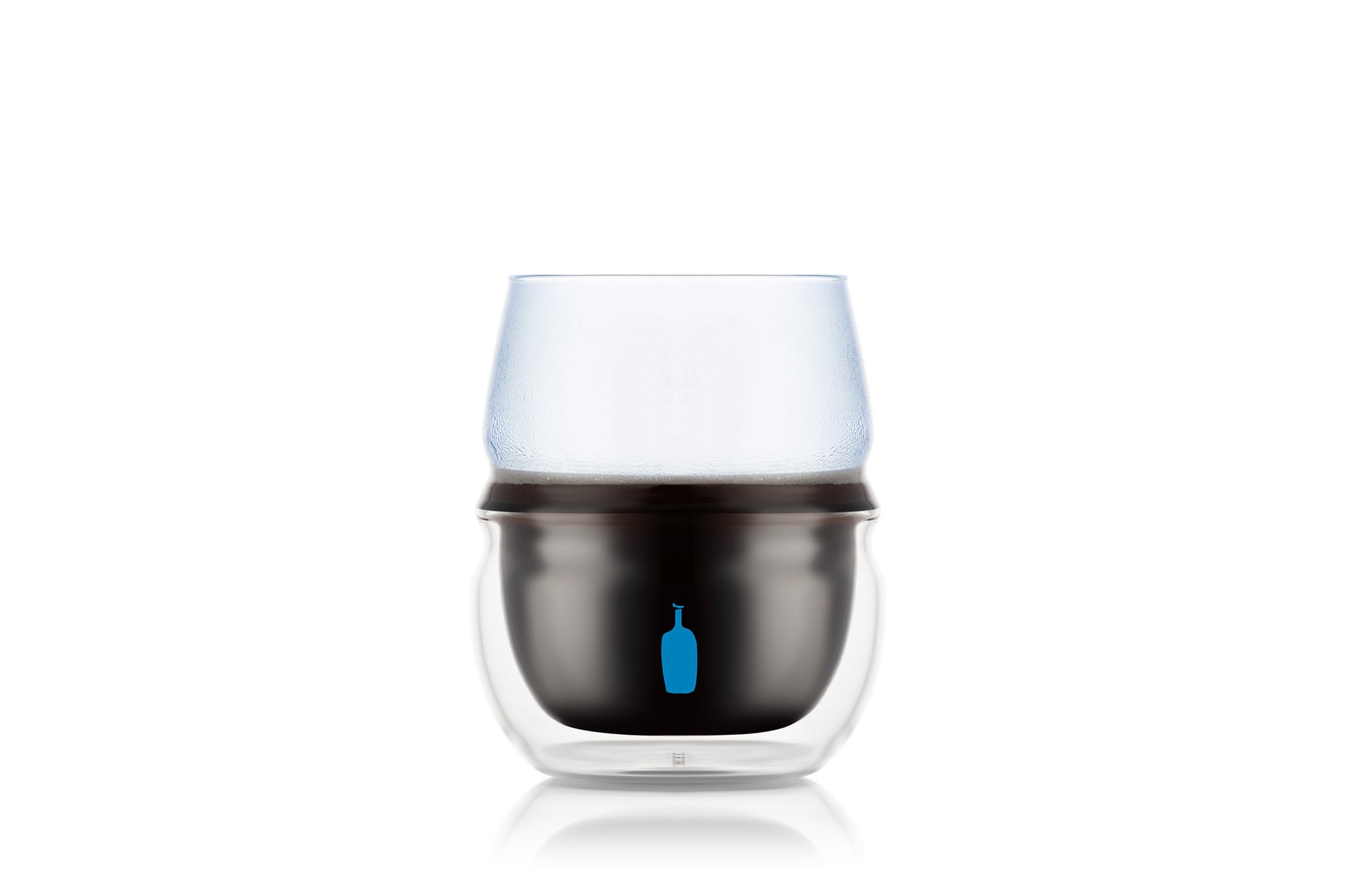 ブルーボトルコーヒーオリジナルカラーのクリアとブルーのバイカラーで、控えめにあしらったボトルロゴがポイントのダブルウォール アロマグラス。ご自宅で楽しむコーヒー体験を彩ります。