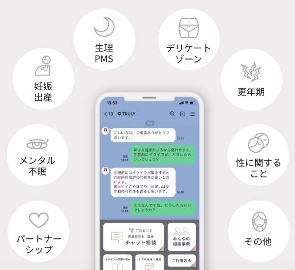 TRULYは、更年期の課題に取り組むフェムテックカンパニーです。これまで閉ざされてきた更年期やホルモンによる悩みや不調に向き合い、一人ひとりに寄り添うサービスを提供しています。