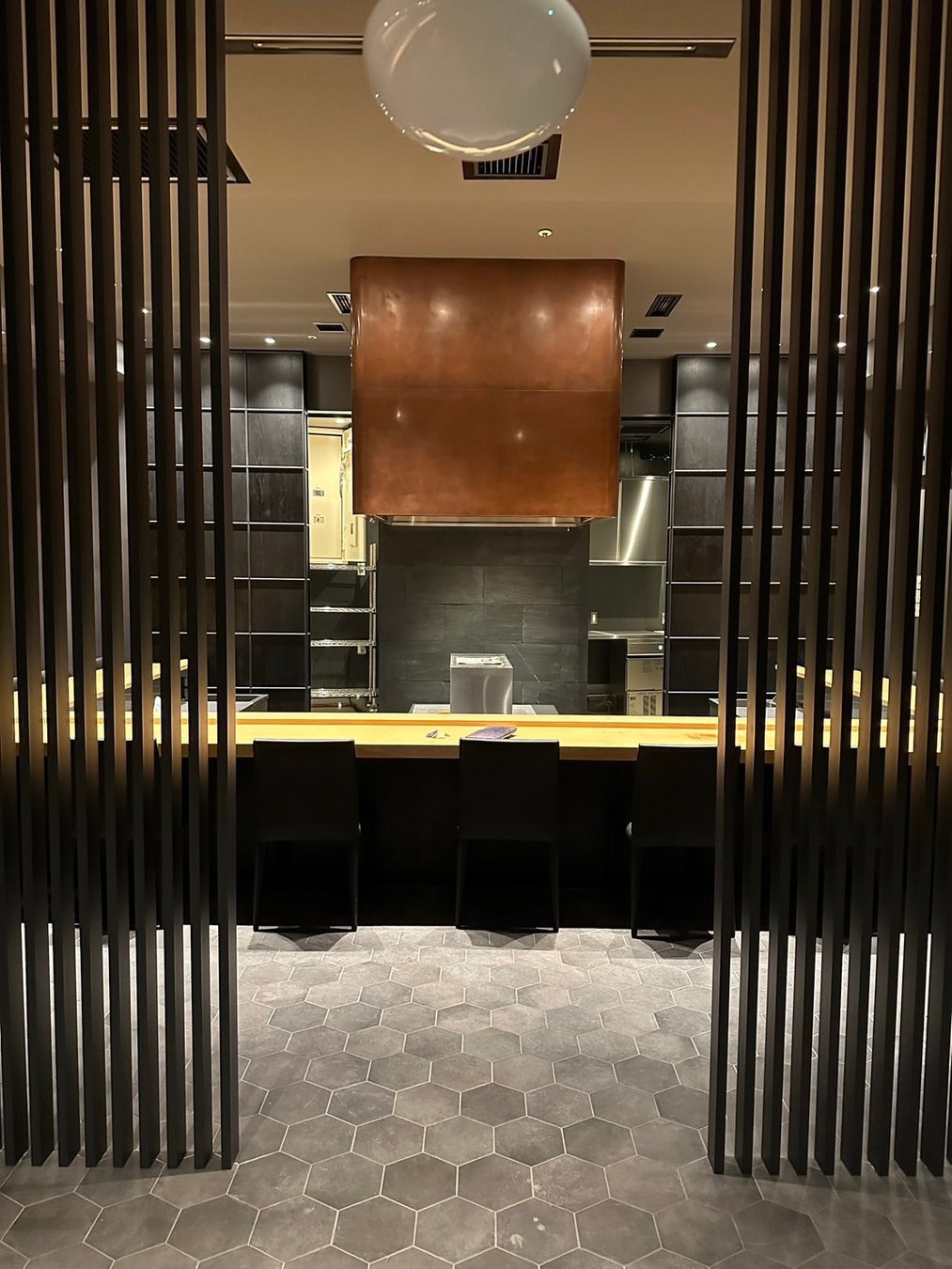木と石で店内を構成し、中央の銅のフードが際立つ造り。
